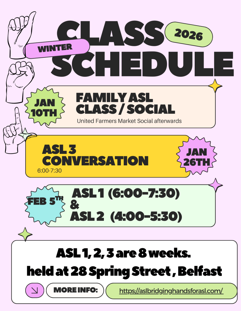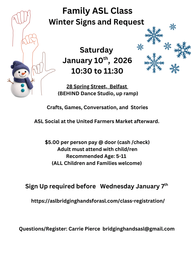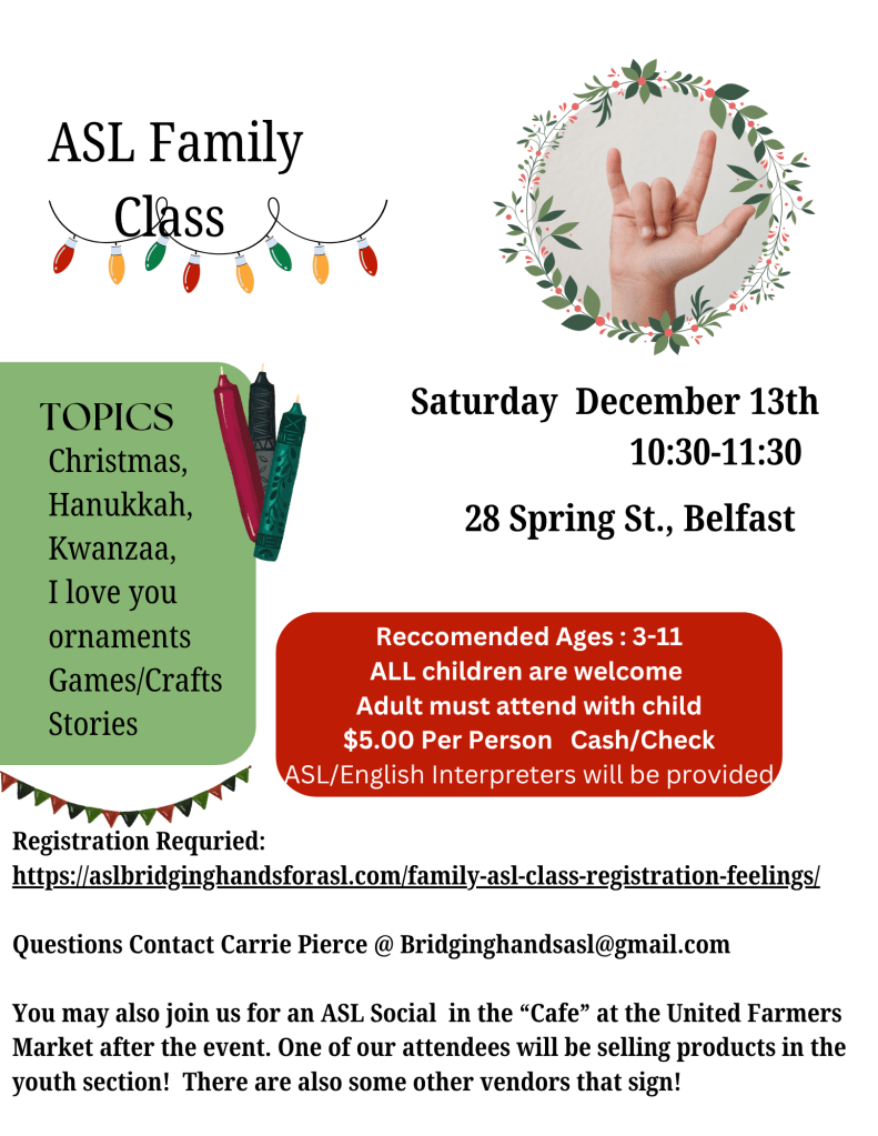 ASL Socials are the second Saturday of the month from 11:30 to 2:00 at the United Farmers Market in Belfast. Find a table, and start signing. There are several signers at the market every week, however you need to be signing for them to notice you! There are some vendors that sign a bit too!