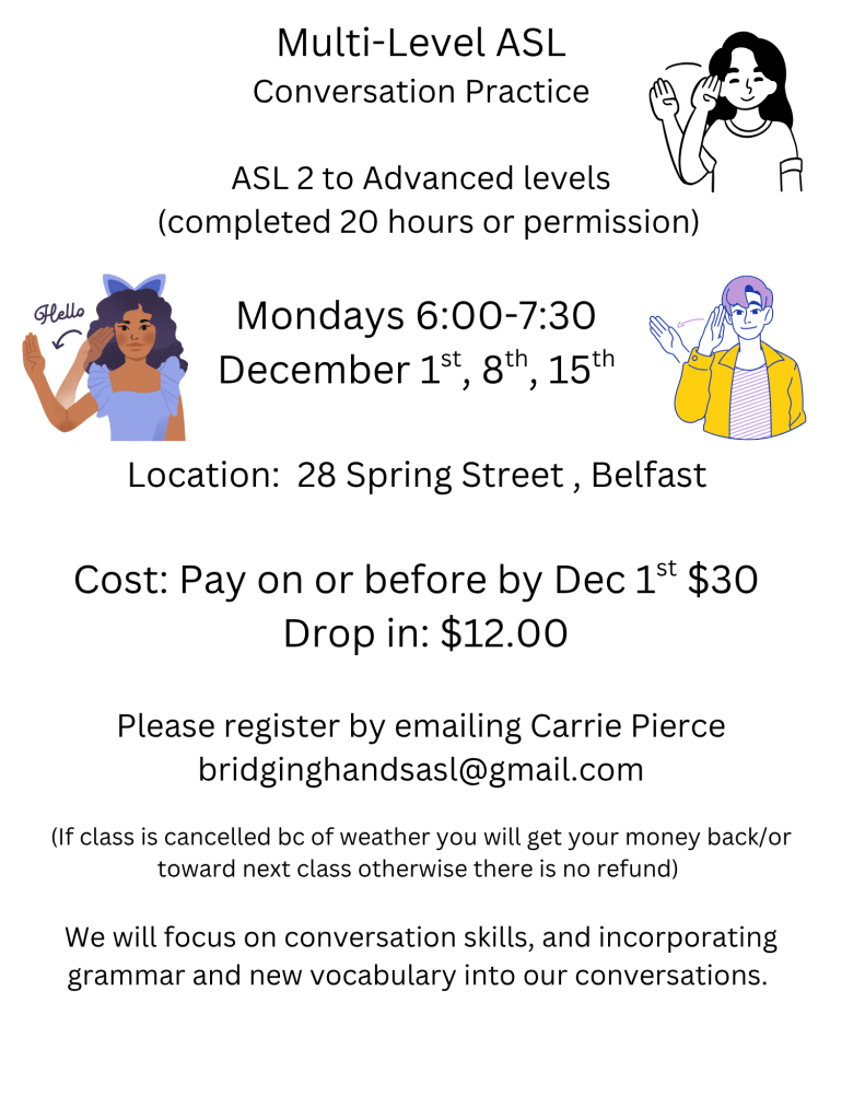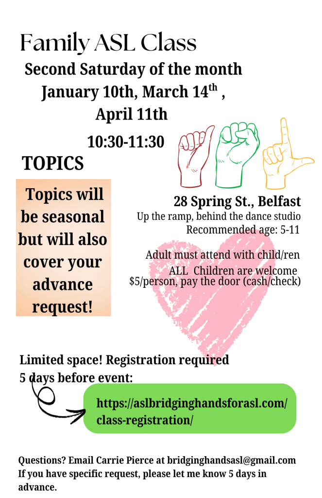 Learn American Sign Language (ASL) in Belfast, Maine, with certified instructor Carrie Pierce.